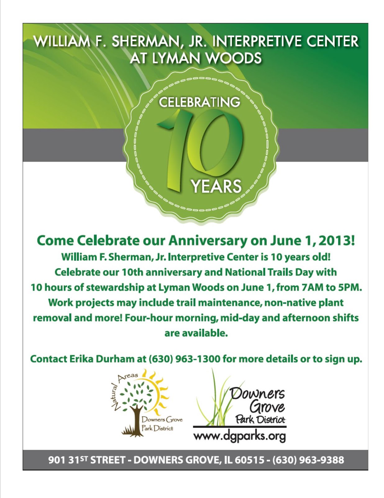 Volunteers are still needed to help celebrate the 10th anniversary of the Interpretive Center and National Trails Day! If you can spare 4 hours this Saturday to help plant native plants, build trellises and sow native seed, contact Erika at edurham@dgparks.org to sign up for one of three shifts!